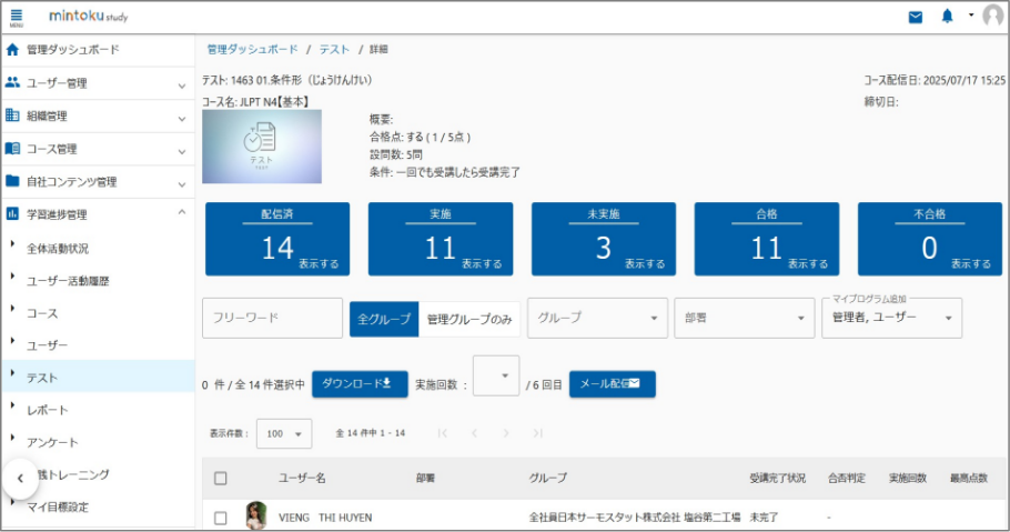 個人やグループごとに動画の視聴状況やテスト結果を確認できます。